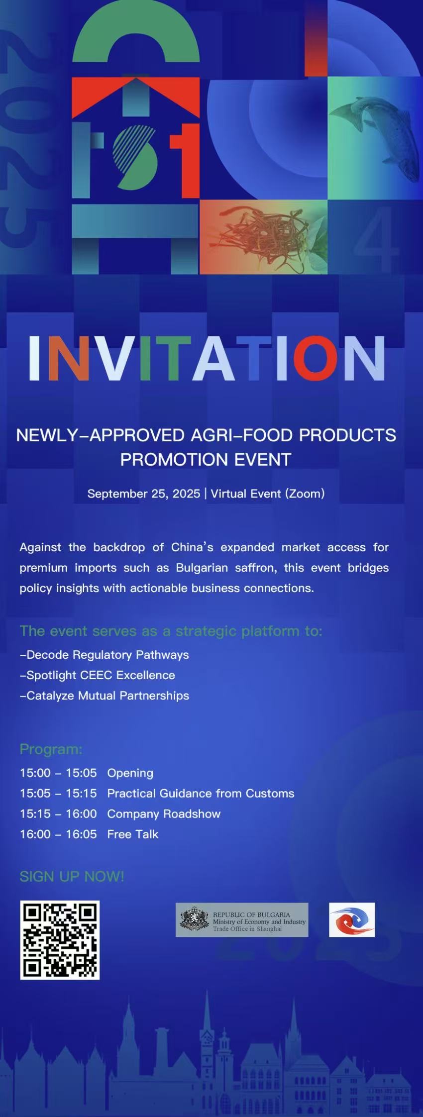 На 29 септември 2025 г., от 10:00 до 11:00 ч., ще се проведе уебинар на тема „Новите земеделски продукти, които са получили разрешение да бъдат внасяни в Китай“ (като шафран и др.).