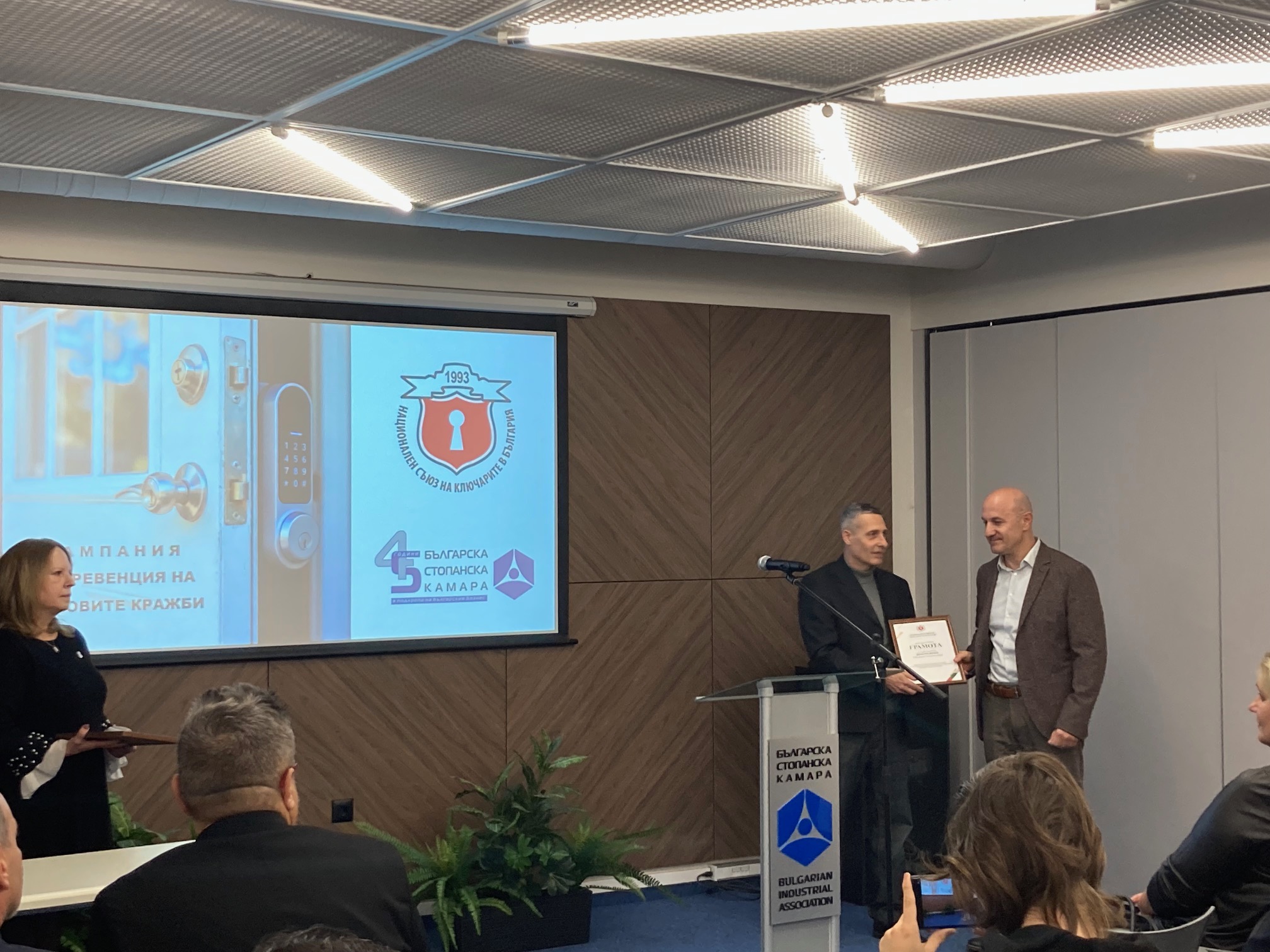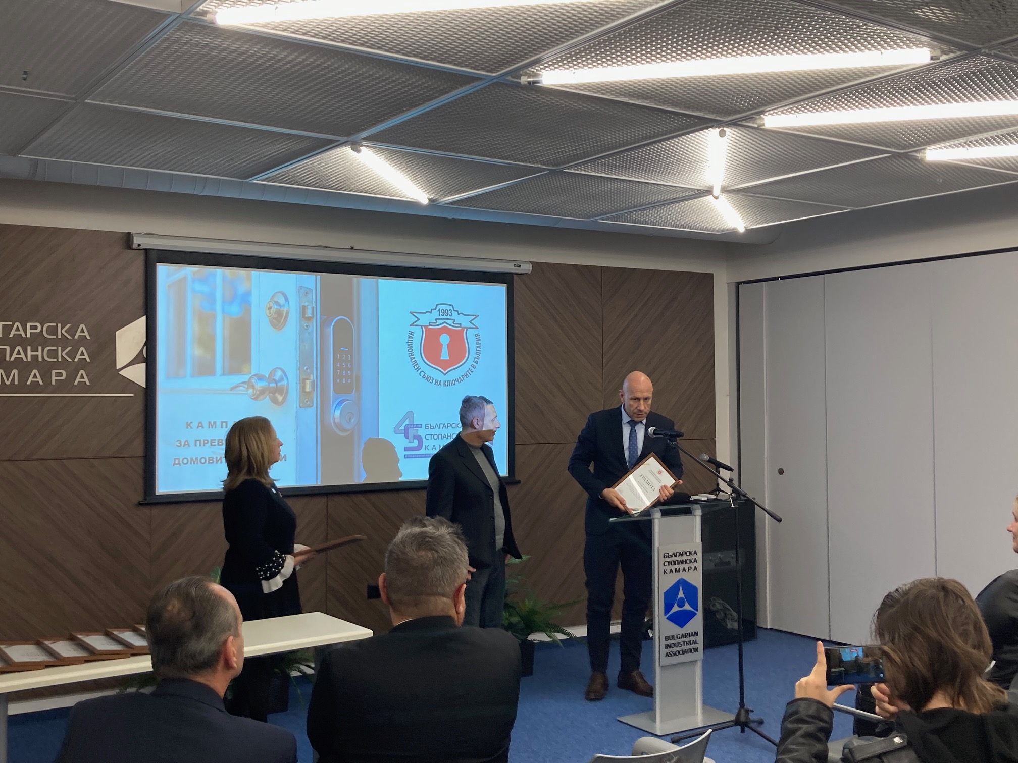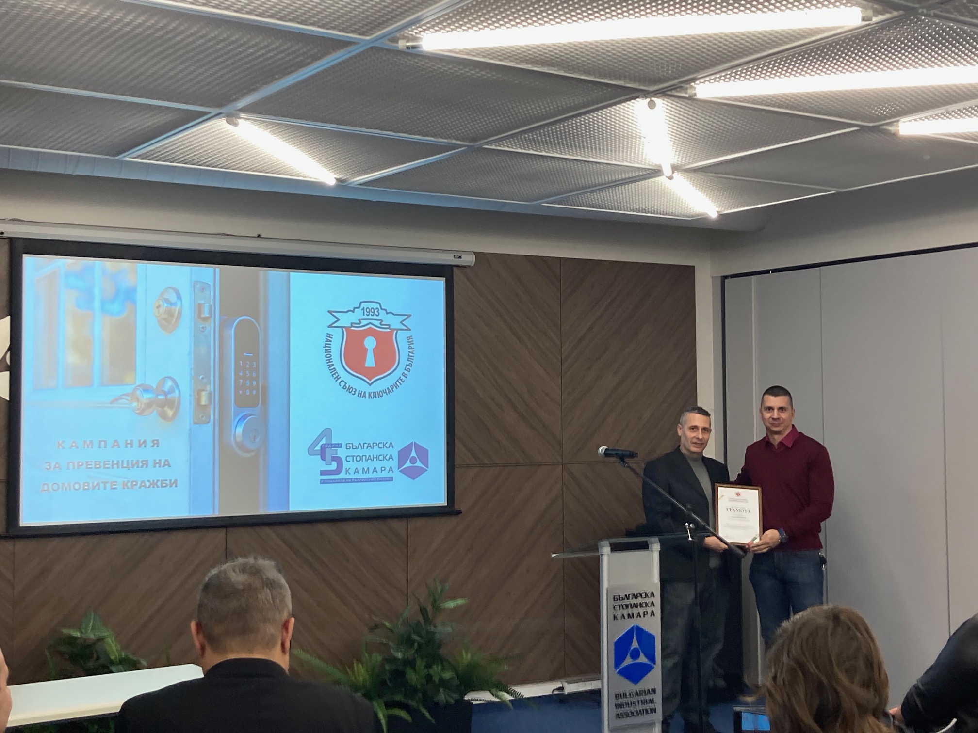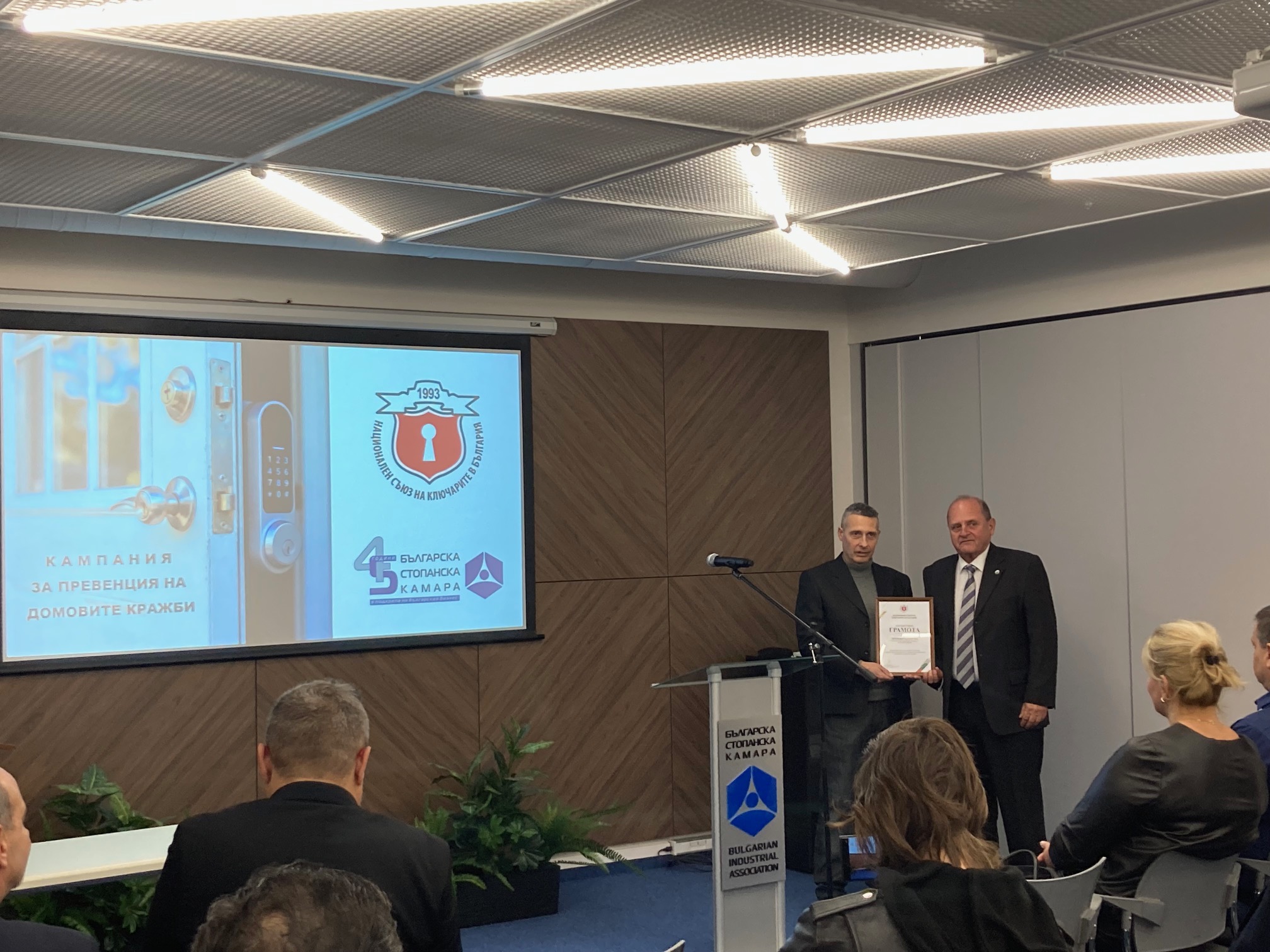 В Българската стопанска камара се проведе официална церемония по награждаване на партньорите, допринесли за успешното реализиране на националната кампания за превенция на домовите кражби, организирана от Националния съюз на ключарите в България (НСКБ). Съюзът е дългогодишен член на БСК и активен участник в усилията за повишаване на сигурността и професионалните стандарти в сектора.