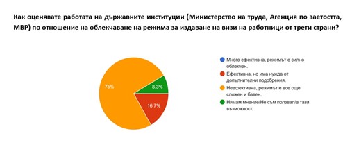 Проучването показва, че визовата политика е сред най-чувствителните теми. Огромното мнозинство от хотелиерите определят режима за работници от трети страни като неефективен, сложен и бавен. В същото време около половината от анкетираните смятат, че облекчаването на визовия режим за туристи от Турция би довело до значителен ръст на пазара, а още близо 40% очакват положителен ефект при допълнителни подобрения.