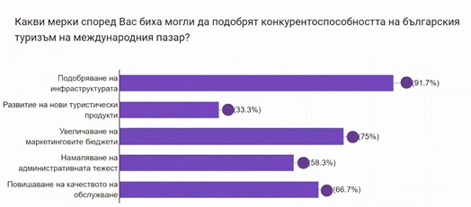 В същото време анкетираните ясно формулират кои мерки ще повишат конкурентоспособността на България като туристическа дестинация. Почти всички настояват за подобряване на инфраструктурата, много голяма част за по-големи маркетингови бюджети, над половината за повишаване на качеството на обслужването и намаляване на административната тежест. Значителен дял подчертава нуждата от развитие на нови туристически продукти.